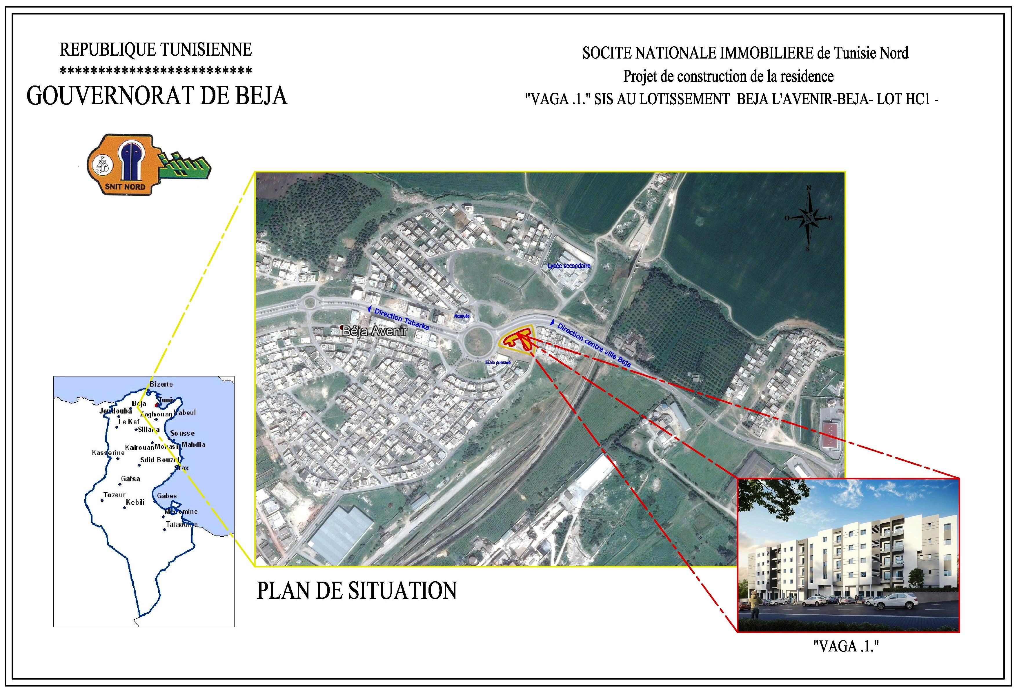 Snit Nord met en vente à la résidence VAGA se situe au Beja l’avenir des appartements Standing-Economique, Elle vous propose des appartements sur quatre niveaux habitation exclusivement. La résidence se compose d’appartements de type S+3 et S+2 répartis sur trois blocs et réunis autour d’un patio agrémenté par de la verdure. les appartements font une superficie qui varie entre 88m2 et 135 m². Descriptions : résidence r+4 (3 blocs, 59 appartement). Salons et hall marbre blanc, chambres marbre thala. Cuisine et salle de bains et salle d'eau en gré. Fenêtre et porte fenêtre électrique, porte d’entrée en bois noble. . Parking et espace vert. Résidence clôturée gardée et sécurisé.